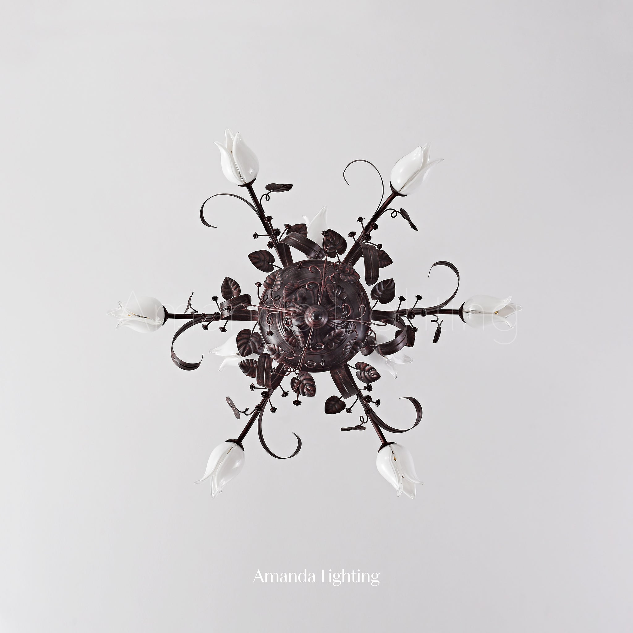 This light fixture is designed with white glass flowers reaching out on beautifully curved branches made with metal tubes - each bent to shape by hand. This is truly a One-Of-A-Kind item that shines with the lights on or off.