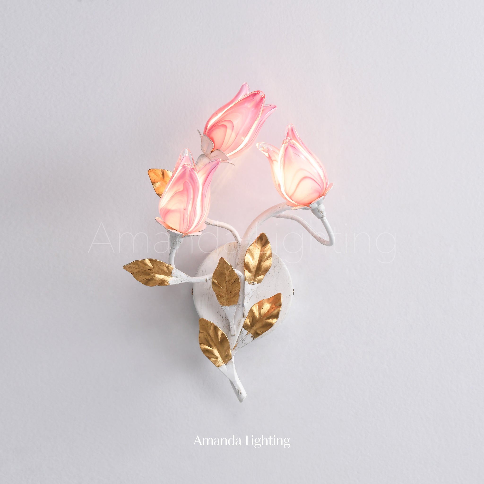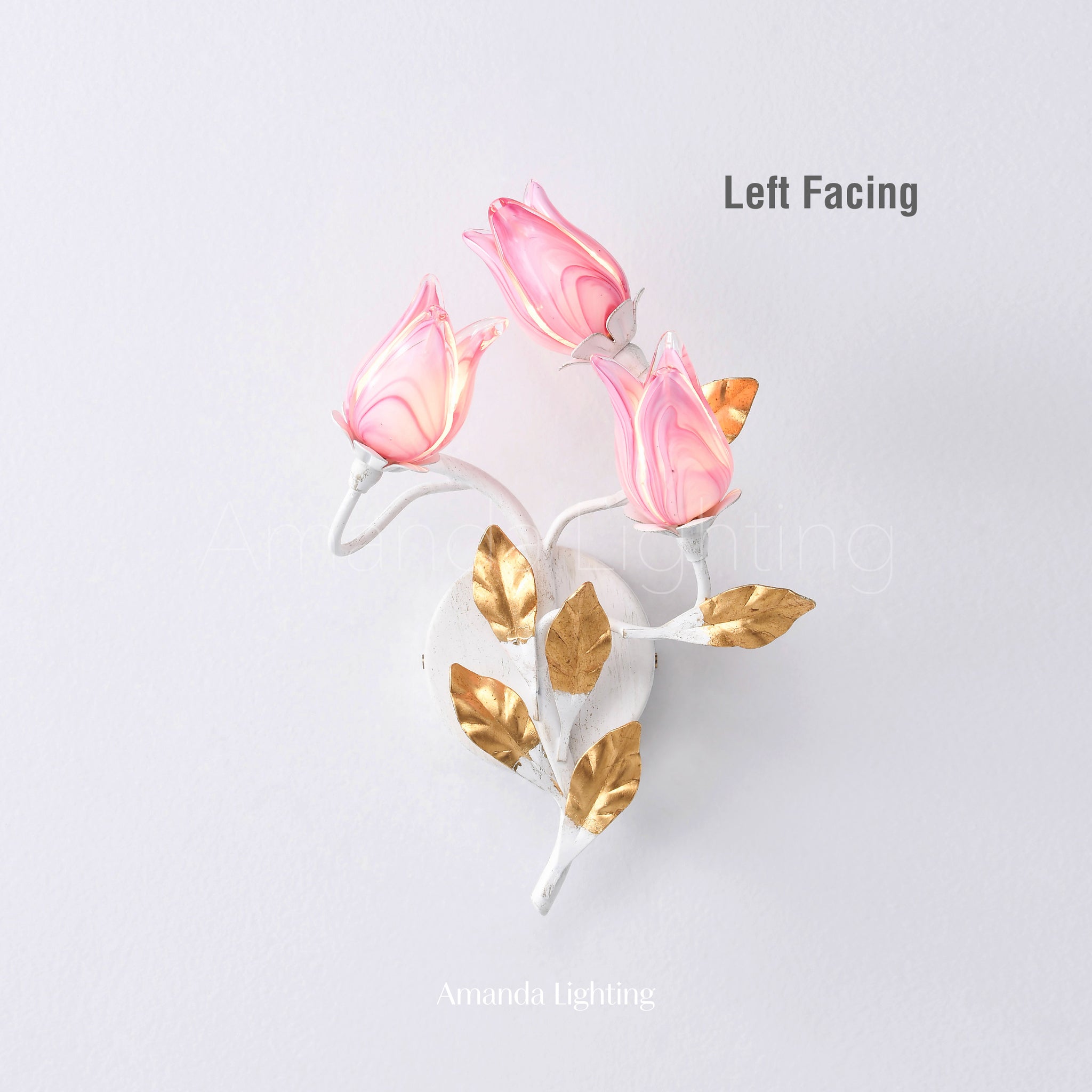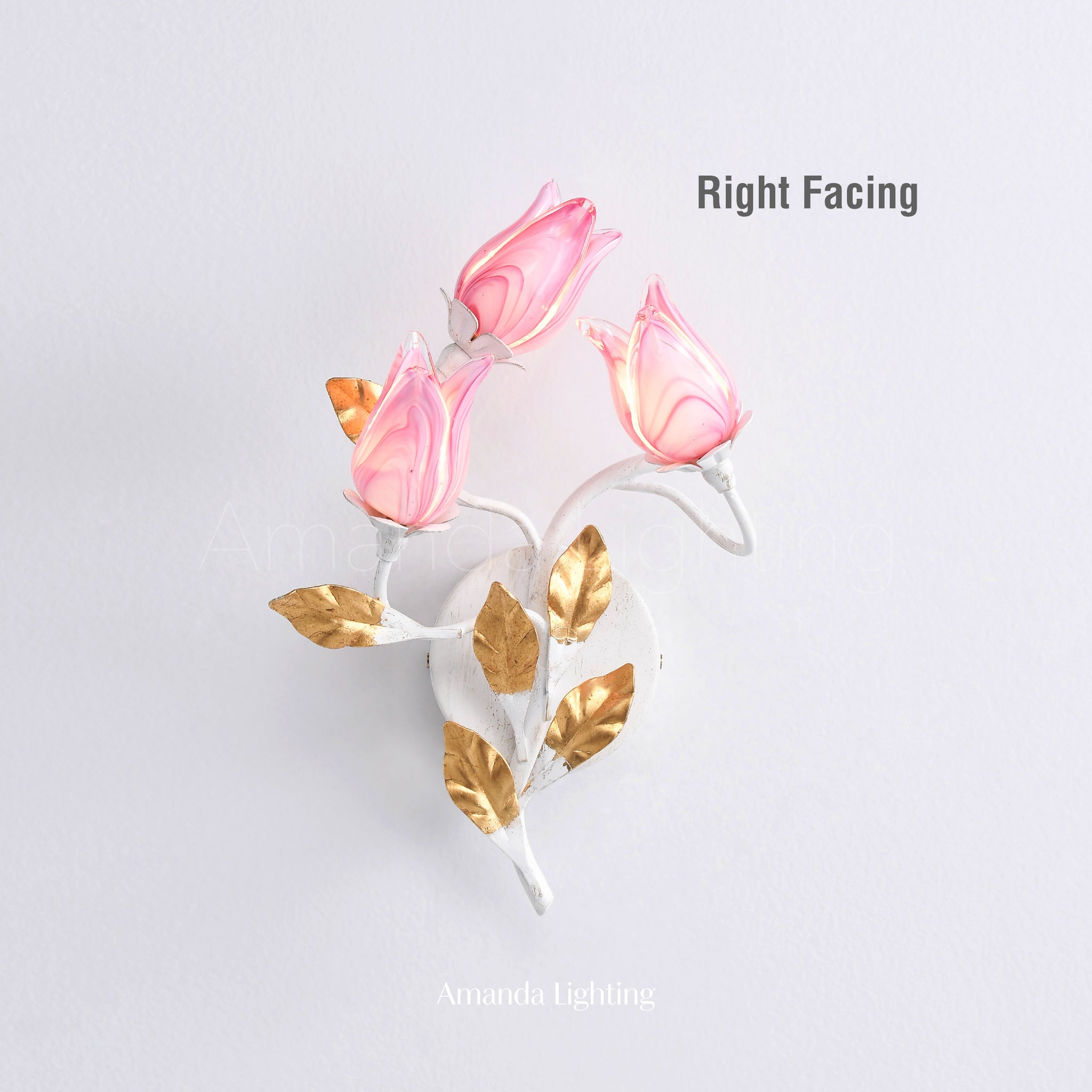This classic wall sconces with an antique white finish is designed with purple pink glass tulip flower shades reaching out on beautifully curved branches made with metal tubes - each bent to shape by hand. This is truly a One-Of-A-Kind treasure that shines rather the lights are on or off.