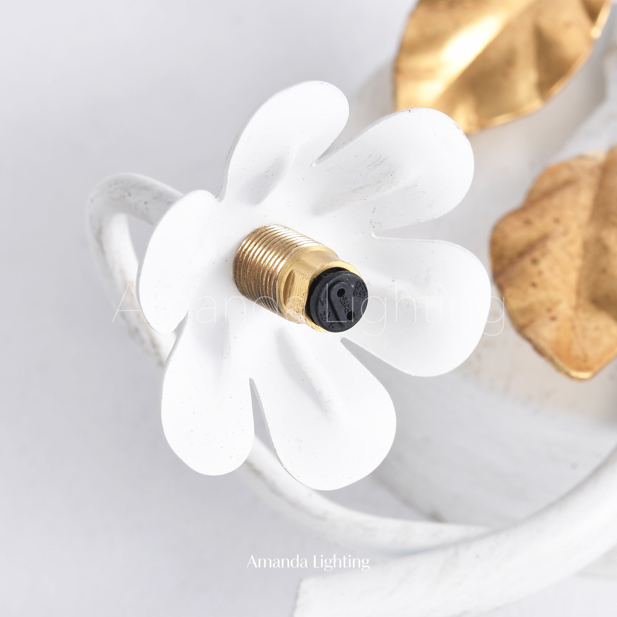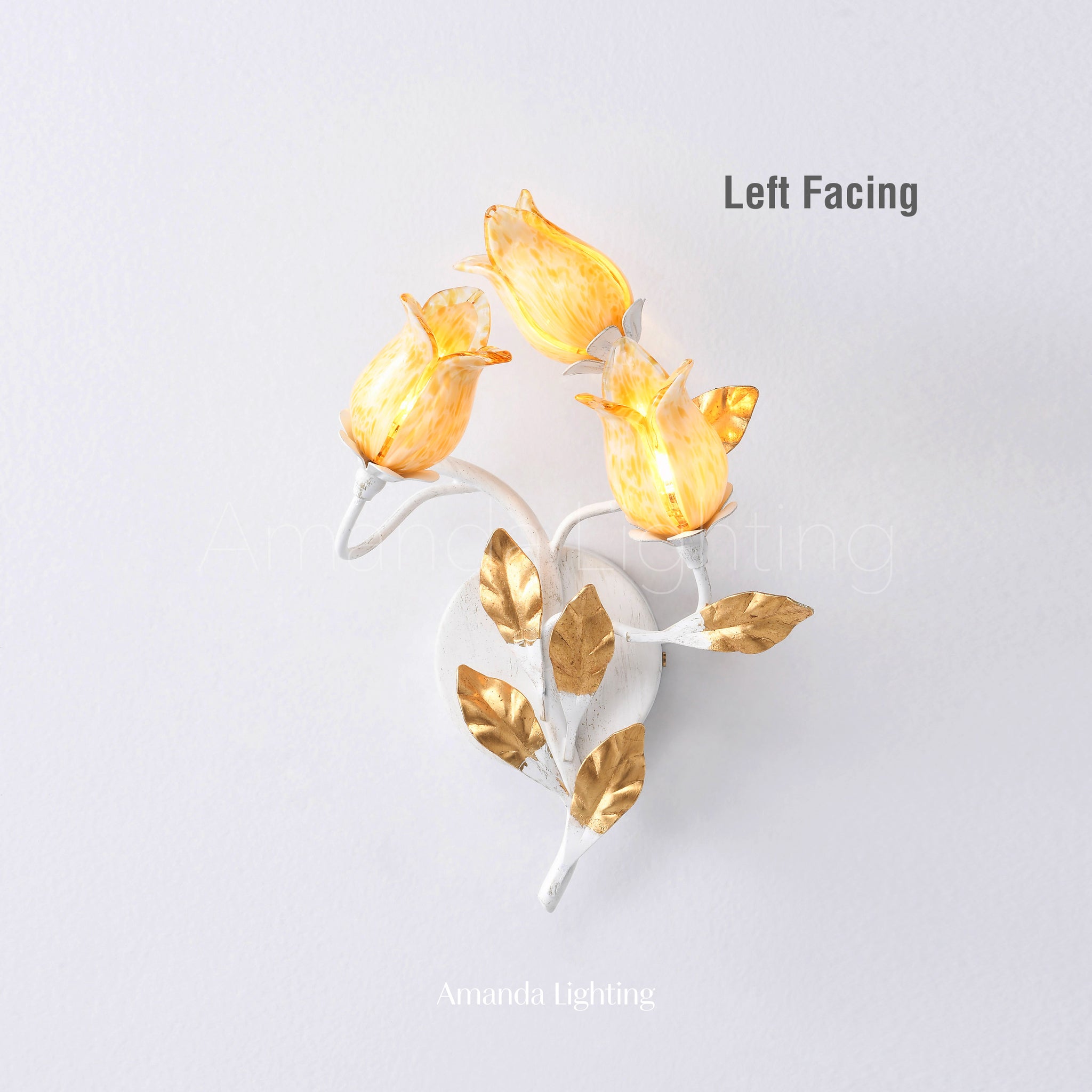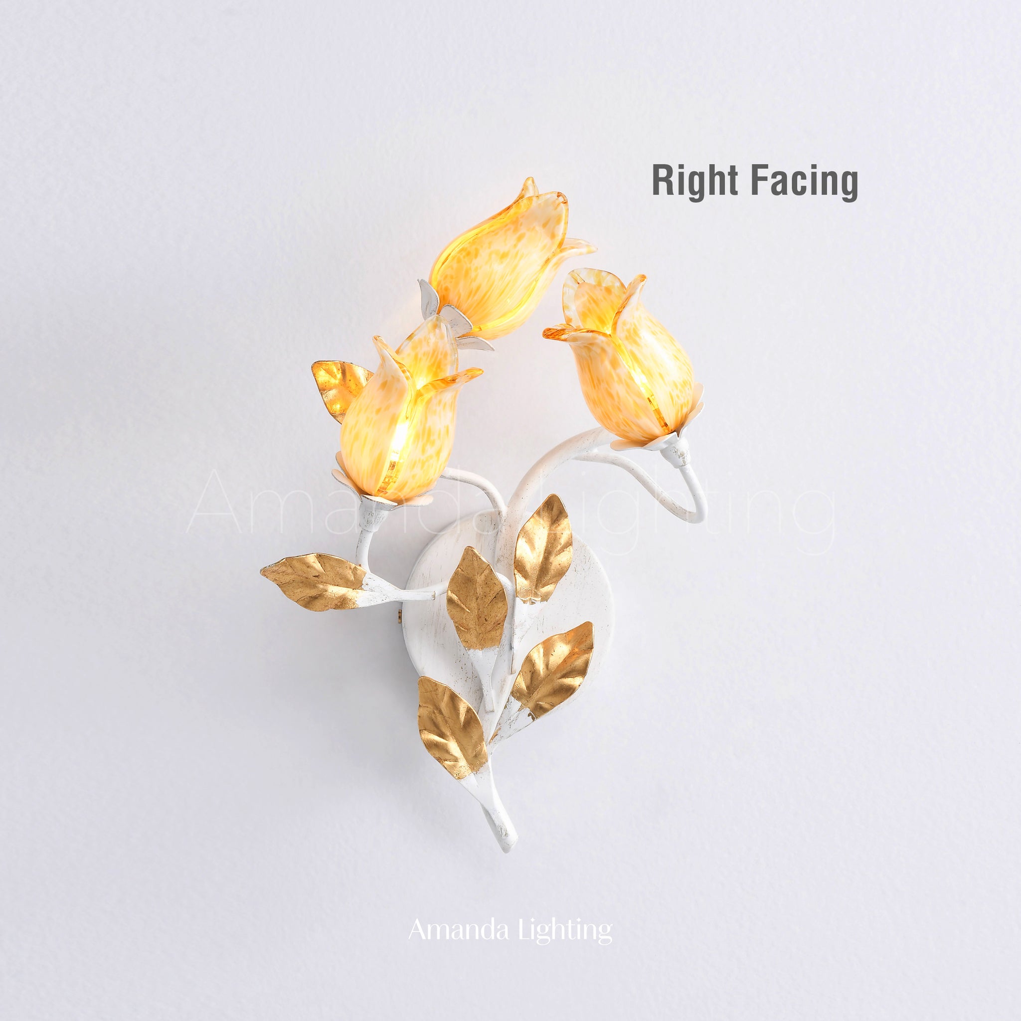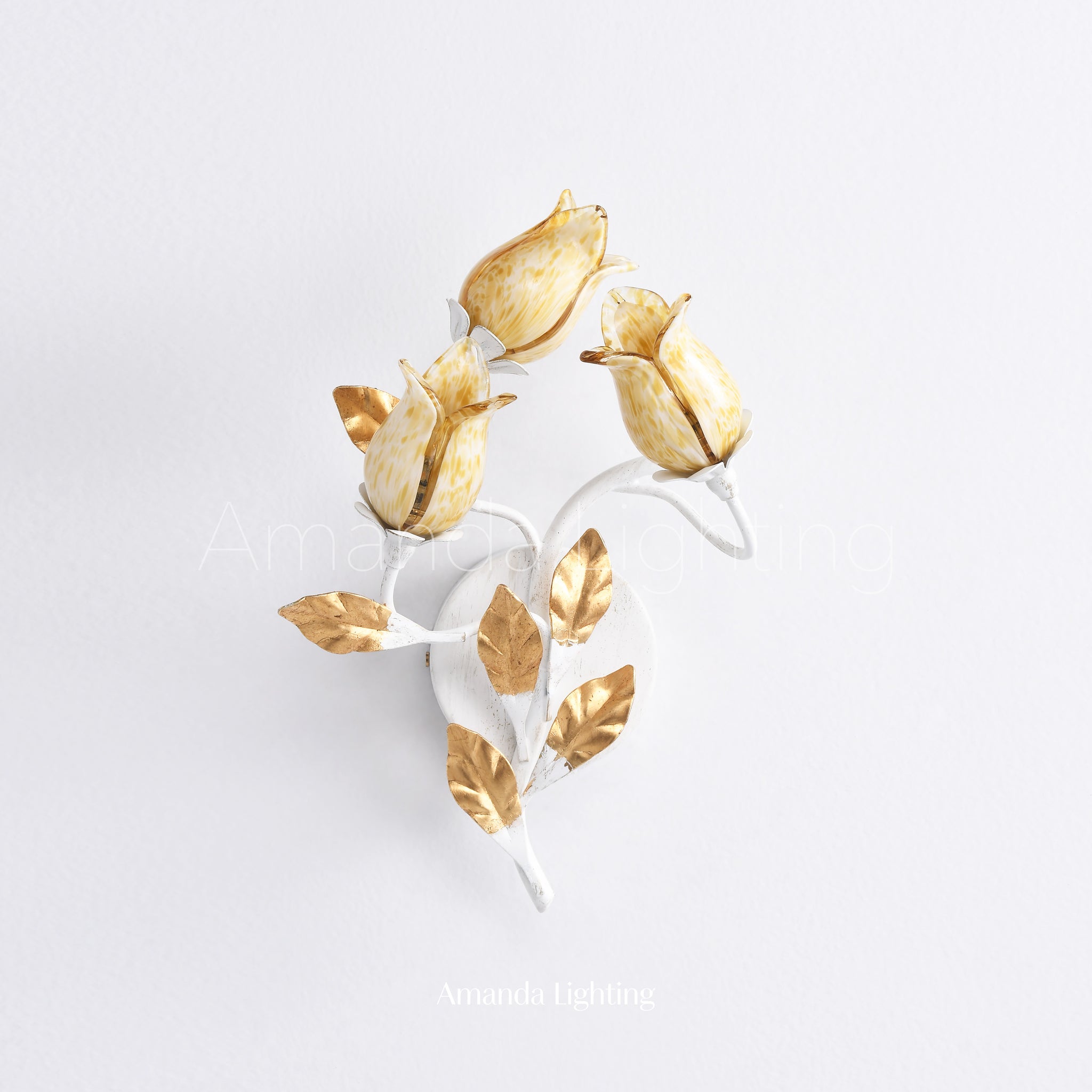This classic wall sconces with an antique white finish is designed with yellow glass tulip flower shades reaching out on beautifully curved branches made with metal tubes - each bent to shape by hand. This is truly a One-Of-A-Kind treasure that shines rather the lights are on or off.